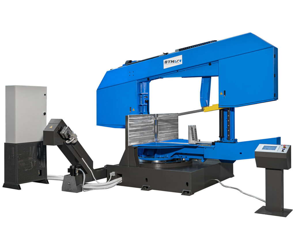 Segatrice a nastro semiautomatica a due montanti con capacità di taglio fino a 60° destra e sinistra, progettata per garantire precisione, stabilità e affidabilità nelle lavorazioni industriali.